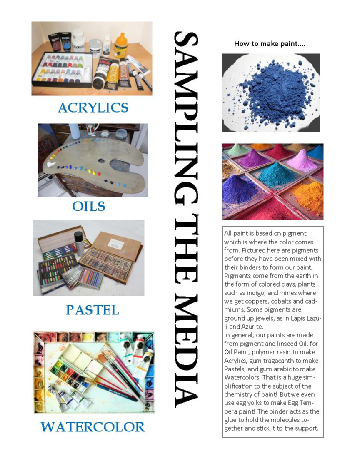A few years ago Carrollwood Cultural Center asked me to teach a class that covered several of the common media so students could investigate their properties and decide which one(s) were a fit for them before signing on to a full time class. It has proved to be very popular and in the Winter of 2015 I decided to consolidate my handouts for this class and make this booklet. I was printing so much for each class it seemed difficult to keep up with the demand! In this 16 page booklet you will find articles about each of the 4 media and a suggested supply list to get you started in each of them. The materials I suggest are as basic as I can be, but are based on supplies I use myself, and not cheap alternatives to professional supplies.