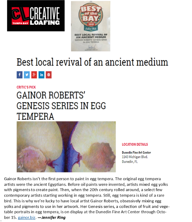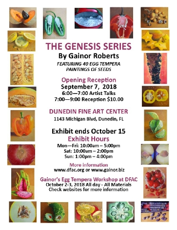 Dunedin Fine Art Center is a prestigious venue in Pinellas County that features art in all its various forms. From classical drawing to the newly developed Culinary Arts program, DFAC delivers both exhibition spaces for art and numerous classrooms for every conceivable form of art. I was honored to be asked to show my Genesis paintings there for the six-week kick off of the Food Inspired themes.